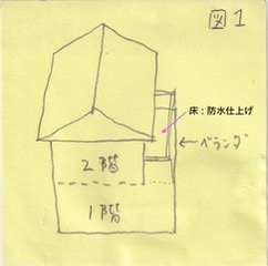 1階室内の真上に防水仕上げのベランダがある住宅は、1階に雨漏りが生じるリスクが高いです。
